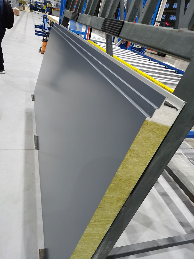 聚氨酯夾芯板,是以阻燃型硬質聚氨酯泡沫塑料作芯材,以彩色涂層鋼板為面材,通過羅拉連續成型,又稱復合板材。它集輕質、高強、隔熱、防水、裝飾于一體,是一種易于生產、施工、安裝的多功能新型建筑板材。目前,國內金屬面硬質聚氨酯夾芯板大量應用于工業廠房、倉庫、體育場館、民用住宅、別墅、活動板房與組合式冷庫等建筑,用作屋面板與墻板。因其質輕、絕熱、防水、裝飾等特性,且運輸、安裝方便,施工進度快,深受設計、施工與開發商的歡迎。